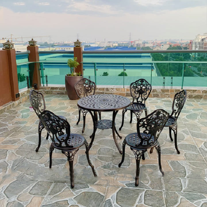 Bộ bàn ghế sân vườn được làm bằng chất liệu nhôm đúc và được phủ thêm hai lớp sơn tĩnh điện cao cấp. Chất liệu này không chỉ cứng cáp mà còn có khả năng kháng nước, kháng gỉ và hạn chế tối đa các tác động từ môi trường. Bạn có thể đặt bộ bàn ghế nhôm đúc nghệ thuật làm bàn ăn/bàn trà tại khu vực sân vườn/ban công mà không phải lo sợ thời tiết bào mòn.