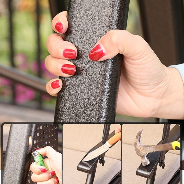 Ghế xích đu sân vườn ngoài trời M2-03 Khung ghế được làm từ chất liệu nhôm đúc được phủ thêm một lớp sơn tĩnh điện cao cấp nên nó có khả năng chịu lực tốt, chống ăn mòn, han gỉ bởi tác động của thời tiết khi để ở ngoài trời. Phần mái che và bọc đệm ngồi đượ may từ vải kaki 2 lớp cao cấp chống thấm, chống ẩm mốc, không hấp thu nhiệt khi để ở ngoài trời nắng.
