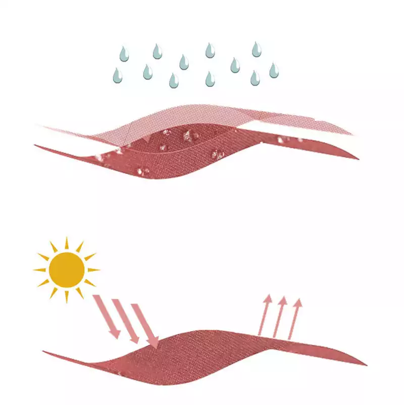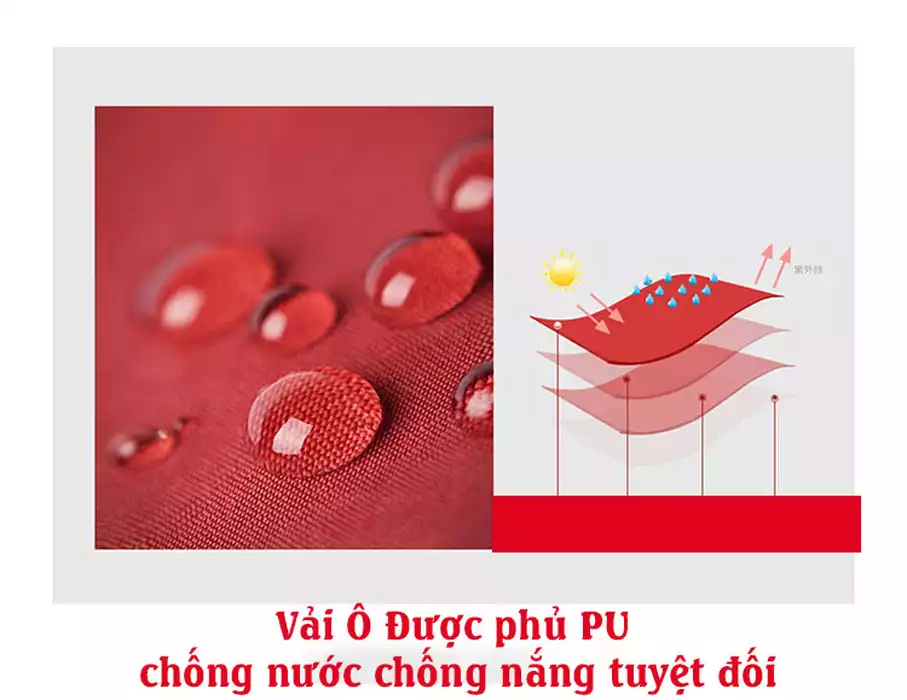 Được sử dụng là chất liệu vải dù polyester (PU hoặc PE), có khả năng chống thấm nước, chống nắn, bền và chống chịu thời tiết để làm vải mái (áo) của ô.